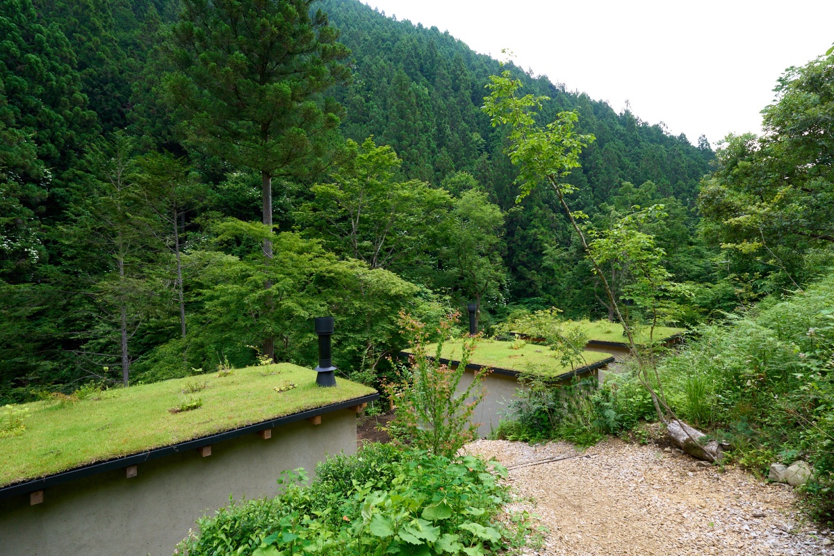Parts of the green roof were intentionally left bare to plant native species from Hinohara, enhancing harmony with the surroundings.