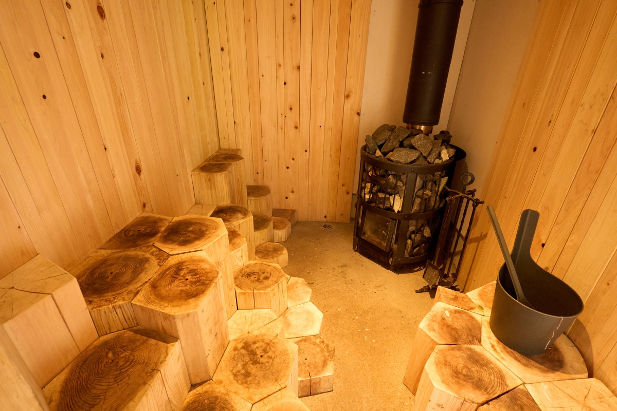 The KITONE site’s sauna room carries a soothing scent of wood. You feed the stove yourself to control the heat.