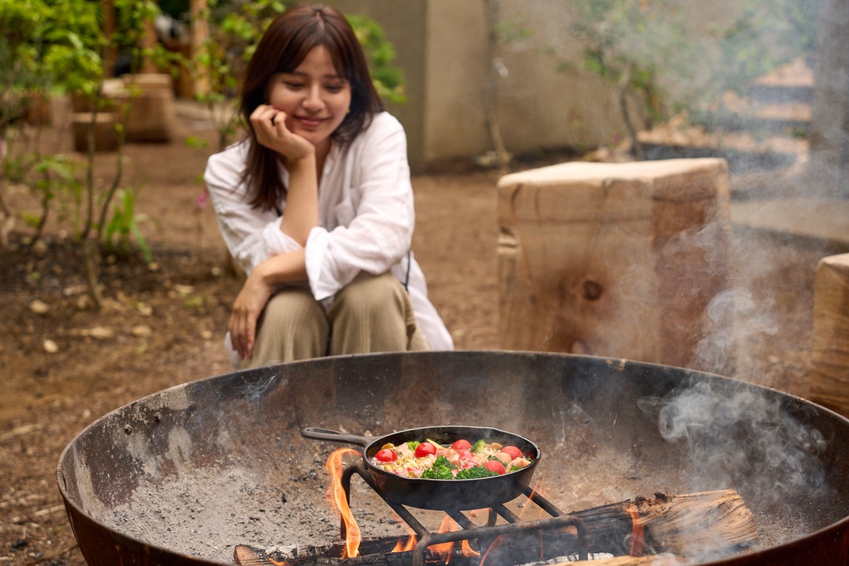 “If the wood is damp or pieces are too thick, the fire won’t take,” says Masuda. “The trial-and-error of lighting a fire contains nature’s wisdom. That’s what we call it—and we hope guests can feel that learning through the campfire.”