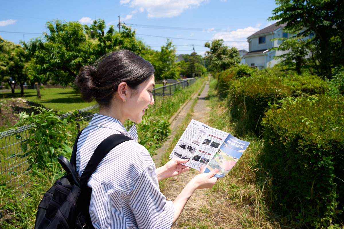 Walking with an “Exploration Map” in hand—the light railway once ran directly above the still-active conduit linking Hamura and Murayama.