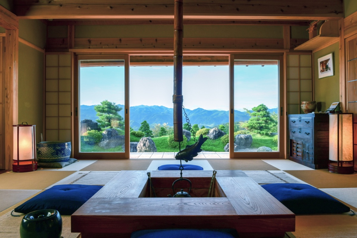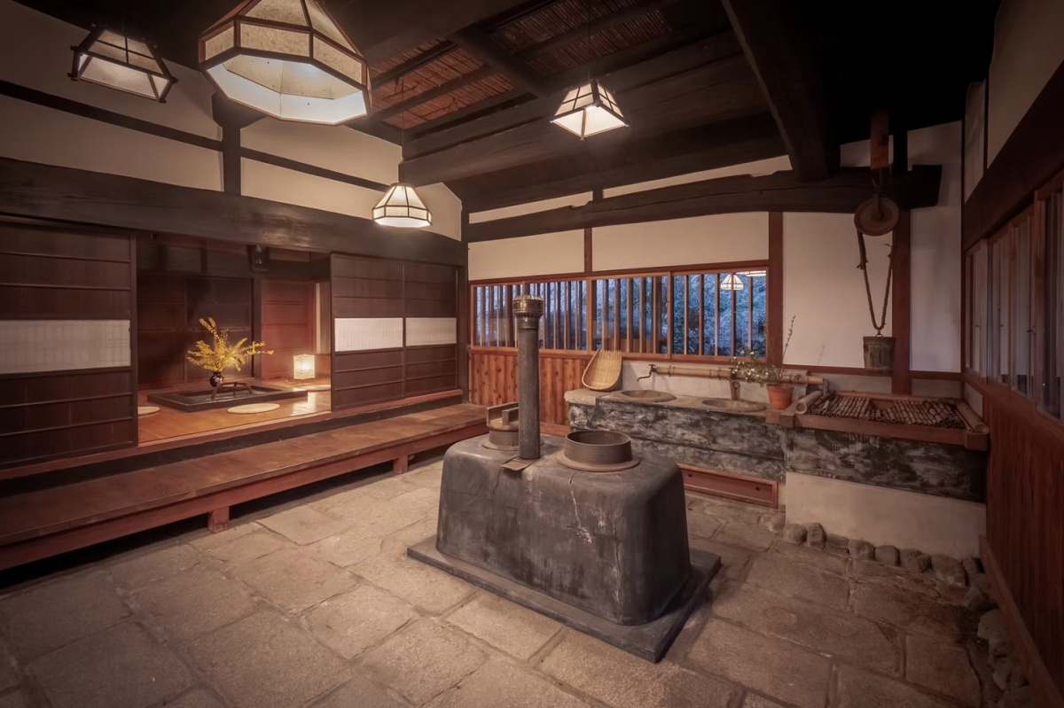 This contemporary restoration takes advantage of paper shoji and glass doors to extend the indoor space to the garden and mountains beyond. The traditional firepit has been raised to serve as a counter. (photo: Rice Terraces Villa Sasayuri Ann)