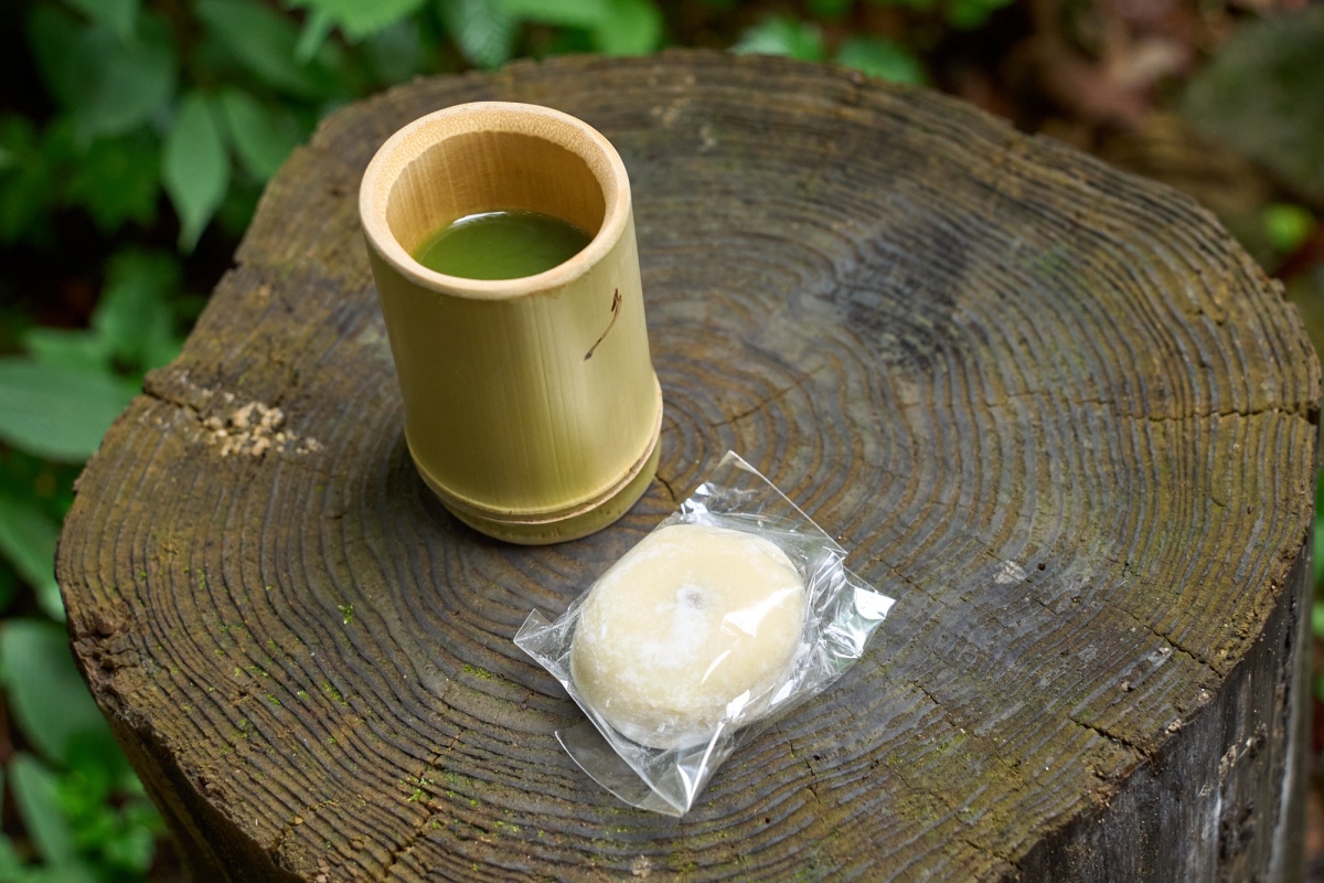 休憩では山の中で、お湯を沸かして淹れてもらった八王子の桑からできた桑茶と、名物のきび餅を味わった。⽵の茶器も地域のおじいちゃんが竹から切って作った地産素材である。