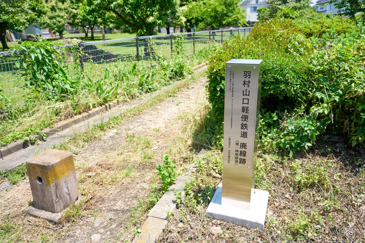 軽便鉄道の廃線跡の一部を、現在、「神明緑道」として整備。その入口には、廃線跡であることを示す角柱が立つ。