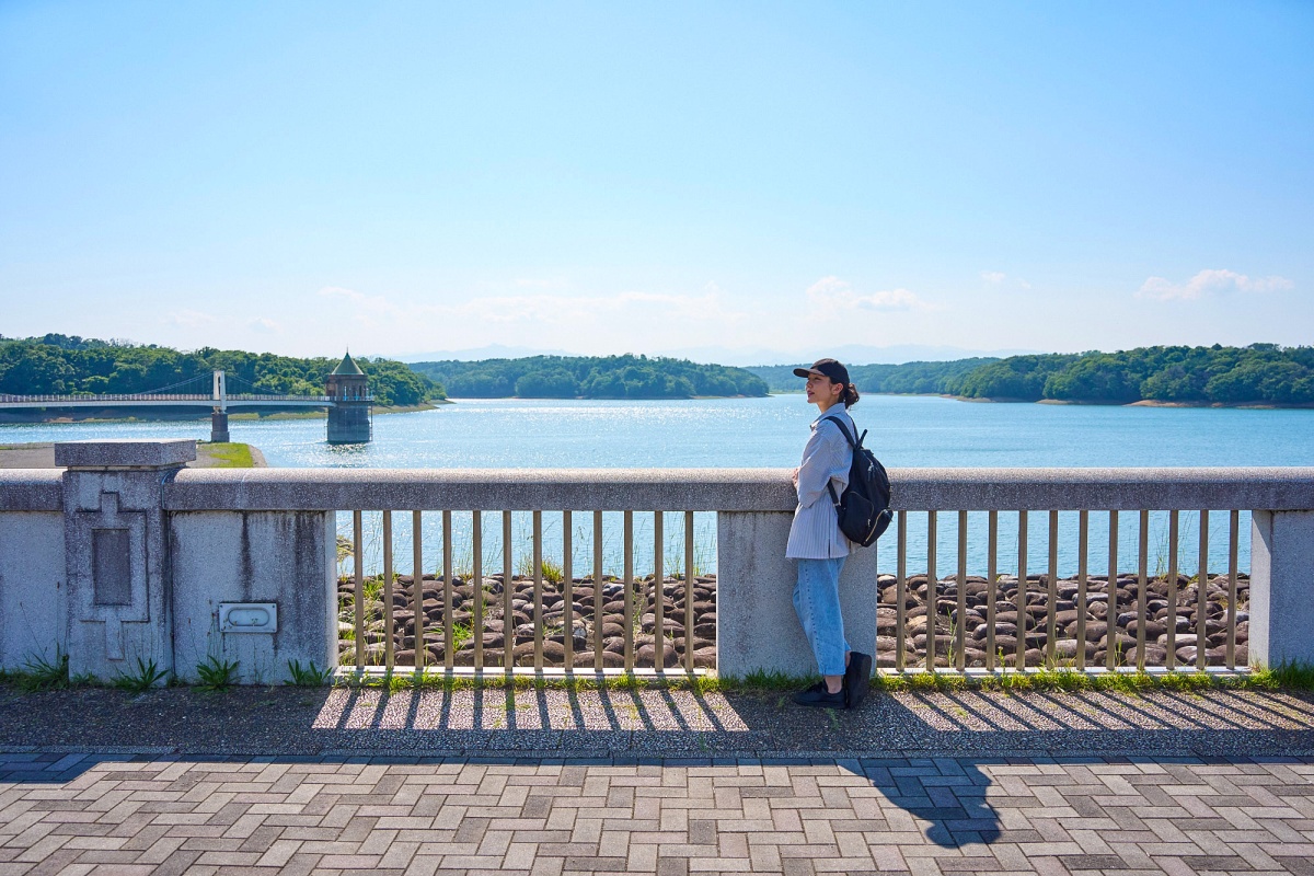 「羽村山口軽便鉄道廃線探検」ツアーの終点・山口貯水池では、あずまや越しに湖の景色が広がる。