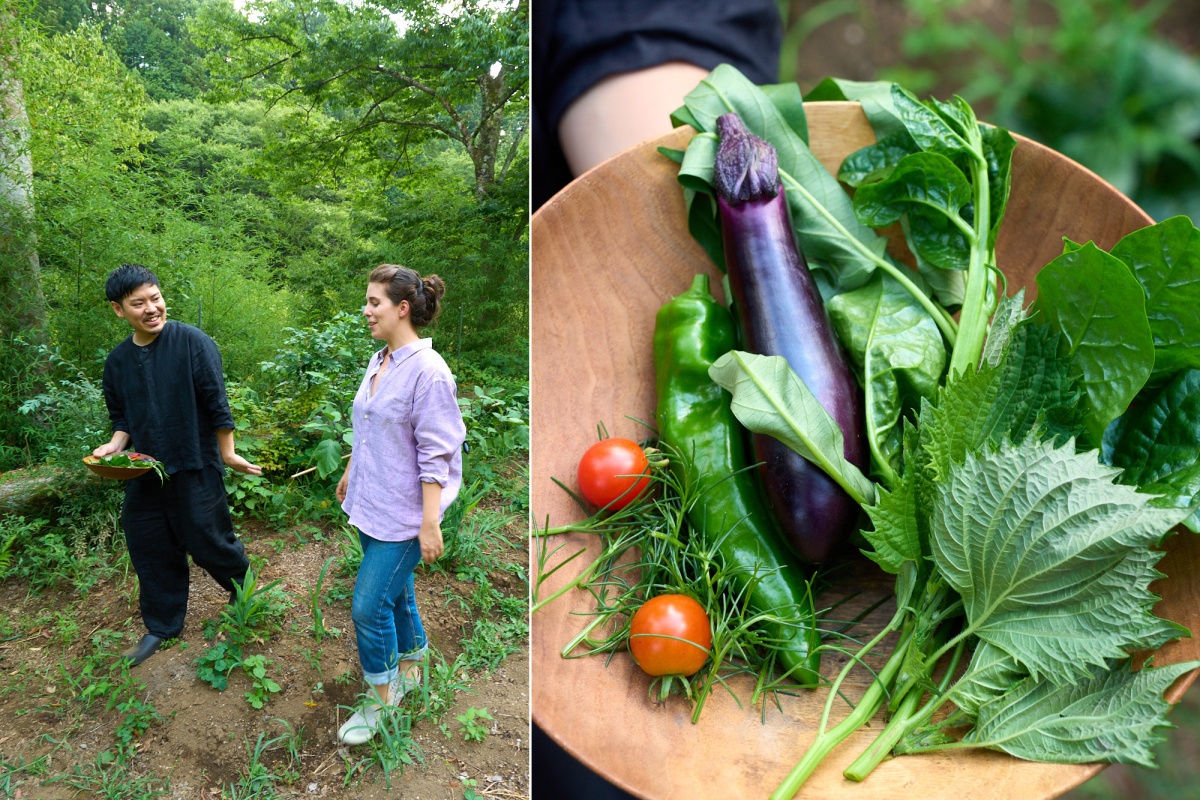 (左)シェフと一緒に自家農園にて野菜を収穫。(右)収穫された野菜は調理してもらい、レストランで味わうこともできる。