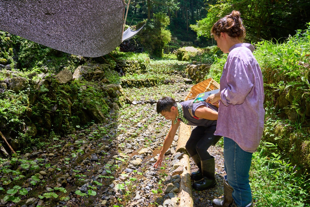 また、地域と連携した体験プログラムも複数ある。そのひとつが、TOKYO WASABIの角井仁さん・竜也さん兄弟が実施する、わさび田ツアーだ。東京とは思えない大自然の山林を分け入り、真夏でもひんやりした清流が走る棚田状のわさび田へ向かう。採れたてのわさびをその場ですりおろして味わえるのは、忘れられない体験となるだろう。