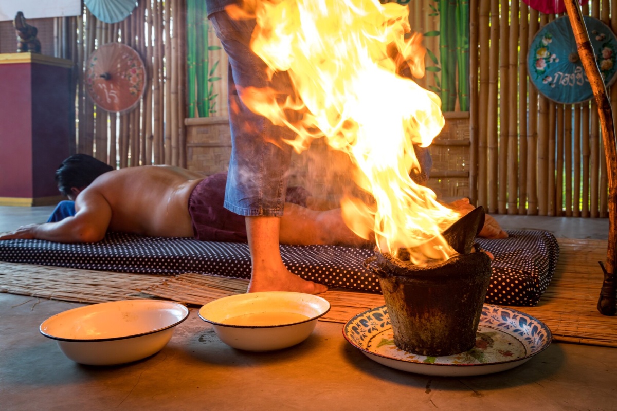 タイ北部のチェンマイの伝統的な温熱マッサージ「ヤムカン」。ファイヤー・マッサージとも呼ばれ、火で熱した足裏で行う独特の施術が外国人観光客にも人気だ。写真提供:タイ国政府観光庁