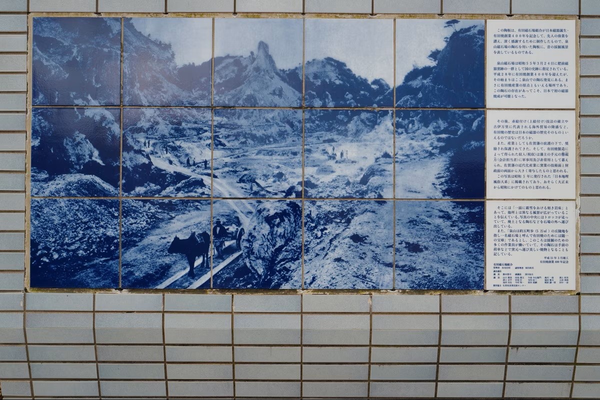 อนุสรณ์สถาน ณ อิซุมิยามะ ที่สร้างขึ้นเพื่อรำลึกครบรอบ 400 ปีแห่งการถือกำเนิดของเครื่องเคลือบดินเผาญี่ปุ่น โดยภาพถ่ายนี้เผยให้เห็นสภาพของเหมืองในปี ค.ศ.1929 (ภาพโดย : Andrew Lee)