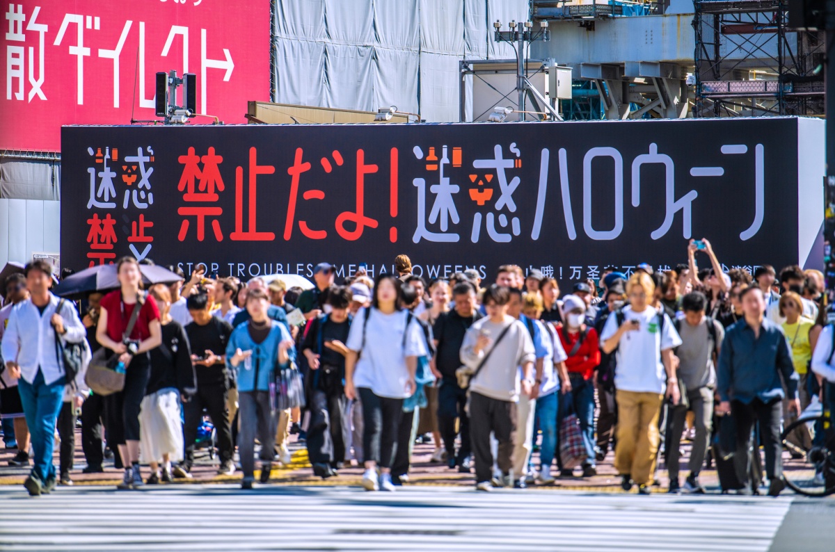 从2010年到疫情前这段时间,提到东京的万圣节,就不能不提涩谷。每年10月31日夜晚,从“涩谷十字路口”到“八公像”前聚集了成千上万身穿各种鬼怪、动漫角色或超级英雄装束的年轻人。 街头变成了摄影打卡、狂欢聚集的大舞台,社交媒体热烈传播这些造型与镜头,使得“涩谷万圣节”成为日本年轻人节日文化中的一大现象。甚至维持秩序的警察也化身“DJ 警察”,也成为了狂欢的一部分。涩谷,也成了众多外国观光客打卡的一个季节特色“景点”。