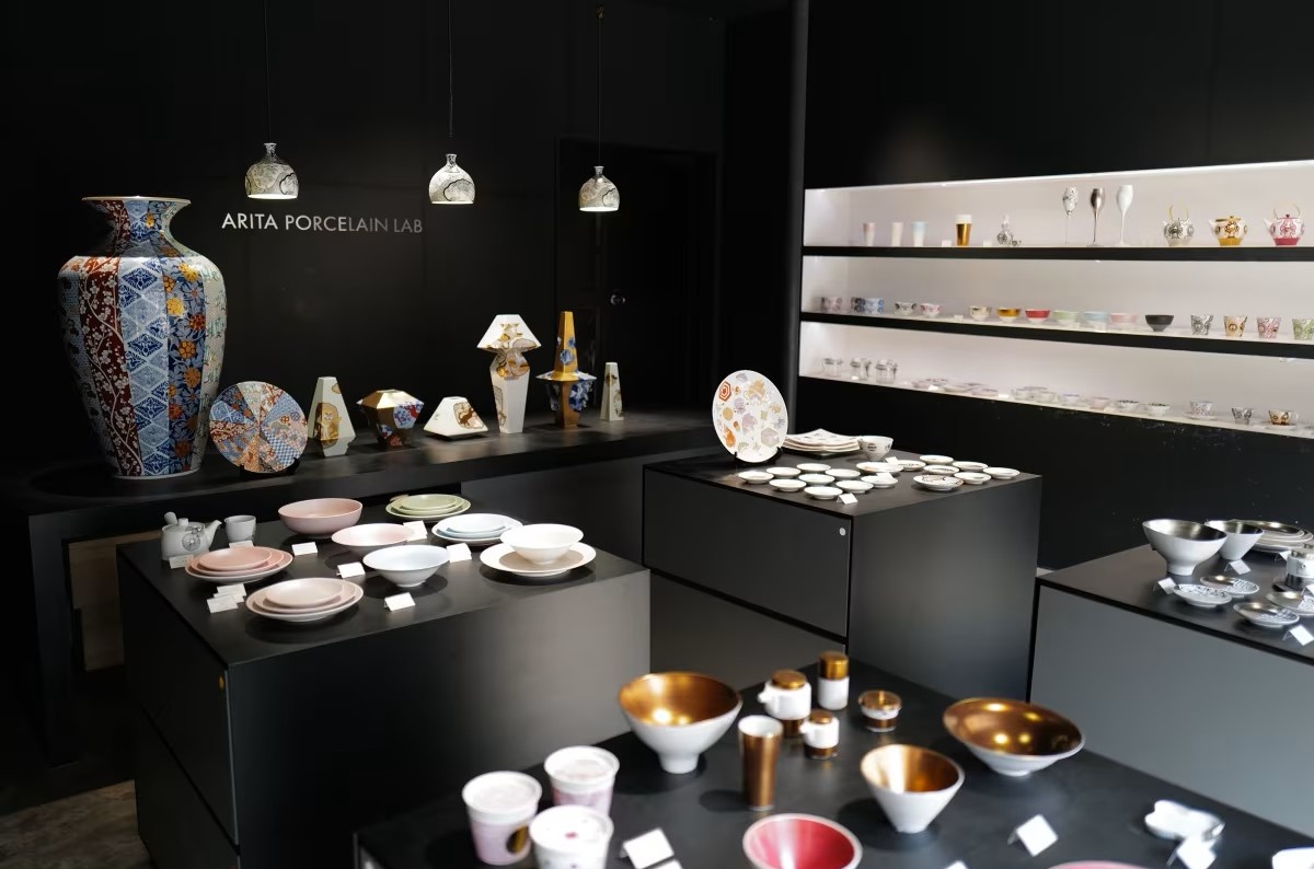 没隔几家店就是Arita Porcelain Lab(有田瓷器实验室)。它是自1804年运营至今的弥左卫门窑的当代品牌。旗舰店后面有一家咖啡馆,提供午餐和咖啡,用的正是自家生产的餐具。这些餐具的特色是线条简洁,以哑光铂金、深酒红色和金色为主。