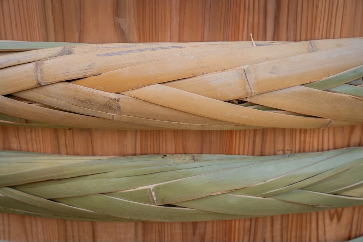 山本康夫正在編製傳統木桶的竹箍(竹たが),這項看似簡單的技藝,卻是維繫整個木桶工藝的關鍵所在。(攝影:Cindy Bissig)