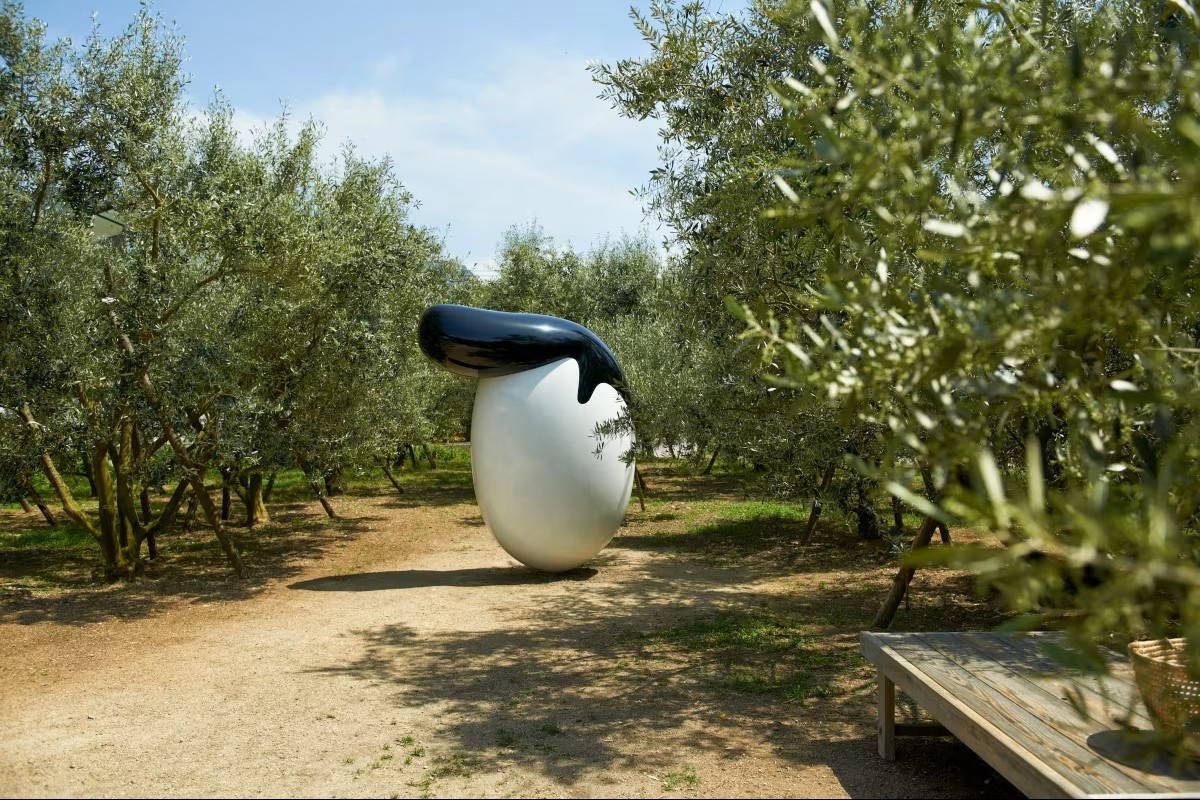 幾件特別值得留意的作品,包含崔正化的《Gift of The Sun(太陽的贈禮)》,是一頂金色橄欖花環,就掛在土庄港入口,迎接每一個踏上島的人;清水久和的《Regent in Olives(橄欖飛機頭)》,一顆橄欖梳著1950年代的飛機頭,底下還兼賣蔬果,無人看守,自行取用投錢。近年加入的,是矢延憲司以「搭船的貓」為概念打造的《SHIP'S CAT》系列雕塑,守護旅途平安的象徵意味,放在這座島上格外合適。